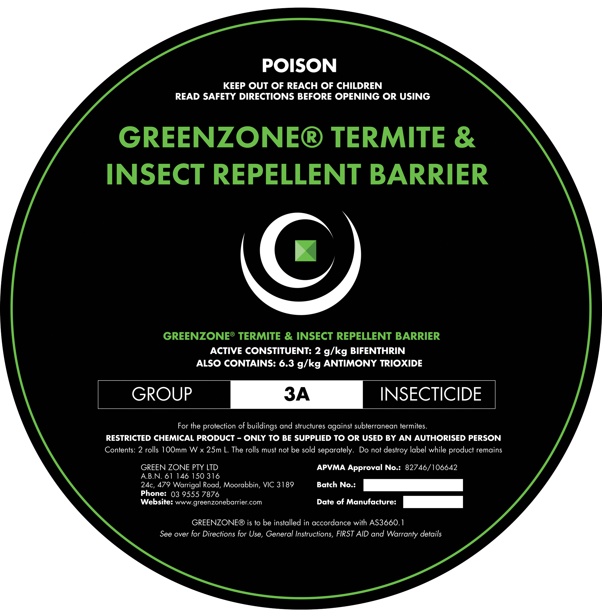 GREENZONE® Termite and Insect Repellent Barrier: Any or all of Green Zone Pty Ltd’s range of pre-construction termite solutions including but not limited to GREENZONE®.
